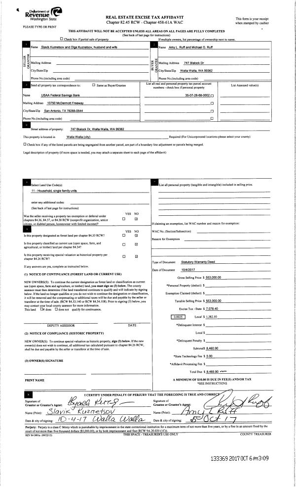| 3 | 10/06/2017 | SWD | STATUTORY WARRANTY DEED | KUZNETSOV SLAVIK & OLGA | RUFF MICHAEL G ESTATE OF & AMY L | | | $553,000.00 | 133369 | 2017-07966 |