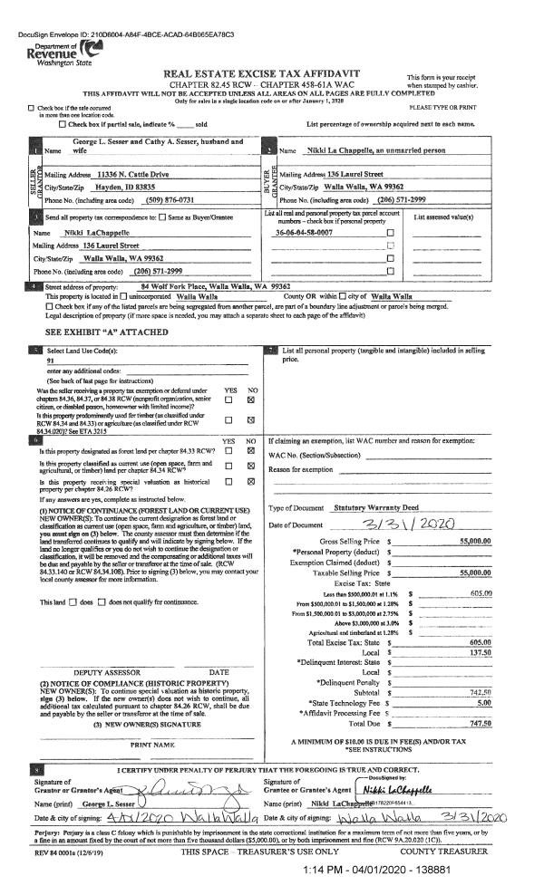 | 2 | 04/01/2020 | SWD | STATUTORY WARRANTY DEED | SESSER GEORGE L & CATHY A | LACHAPPELLE NIKKI | | | $55,000.00 | 138881 | 2020-02871 |