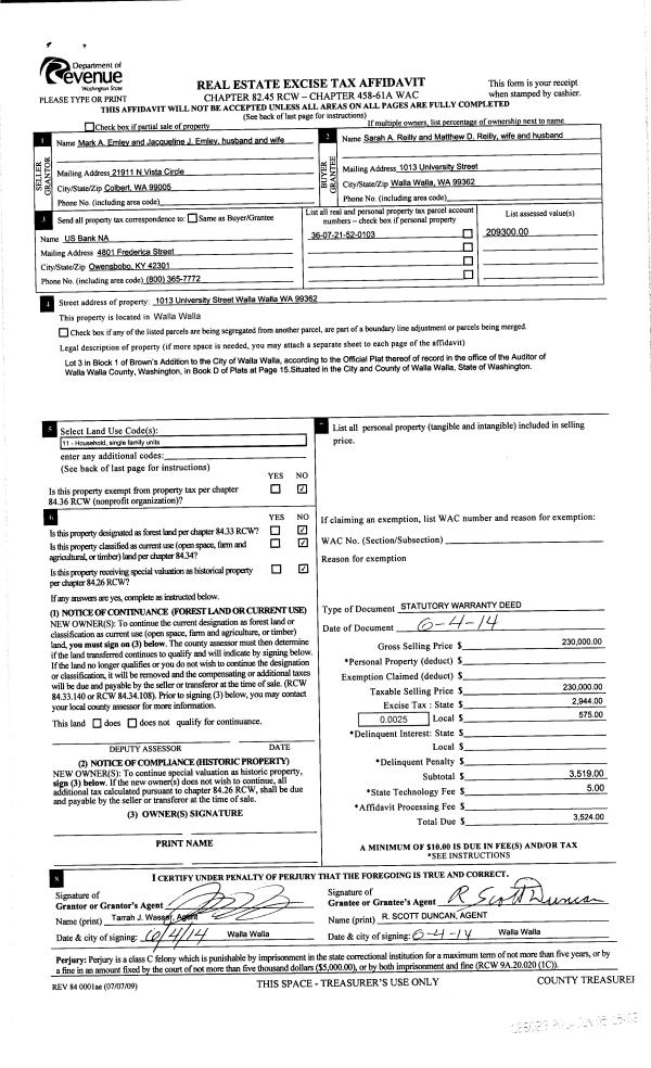 | 2 | 06/05/2014 | SWD | STATUTORY WARRANTY DEED | EMLEY MARK A & JACQUELINE J | REILLY MATTHEW D & SARAH A | | | $230,000.00 | 126023 | 2014-03863 |