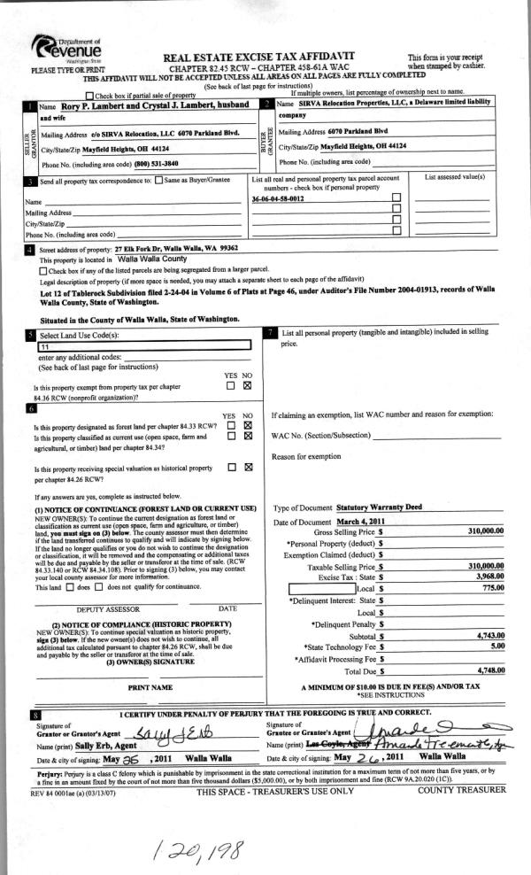 | 2 | 05/26/2011 | WARRANTY D | WARRANTY DEED | LAMBERT, RORY P & CRYSTAL J | SIRVA RELOCATION PROPERTIES LL | | | $310,000.00 | 120198 | 2011-04148 |