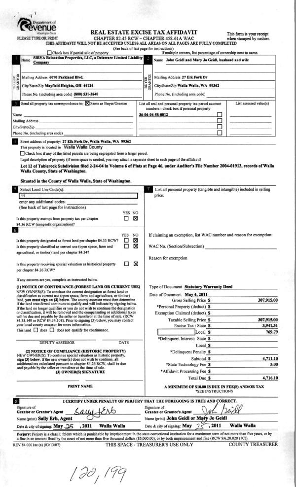 | 3 | 05/26/2011 | WARRANTY D | WARRANTY DEED | SIRVA RELOCATION PROPERTIES LL | GEIDL, JOHN S & MARY JO | | | $307,915.00 | 120199 | 2011-04149 |