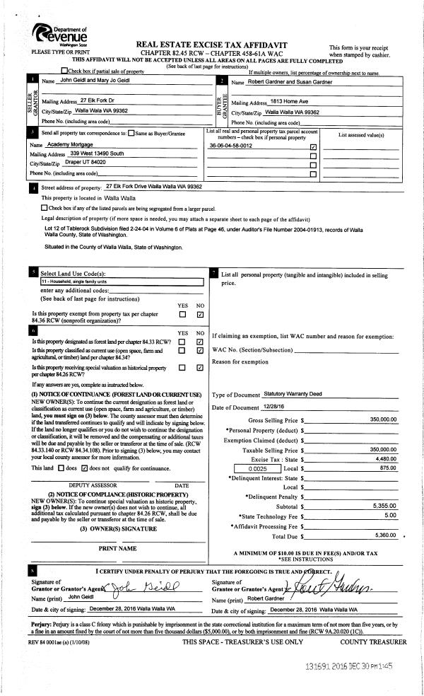 | 1 | 12/30/2016 | SWD | STATUTORY WARRANTY DEED | GEIDL JOHN S & MARY JO | GARDNER ROBERT & SUSAN | | | $350,000.00 | 131691 | 2016-10798 |