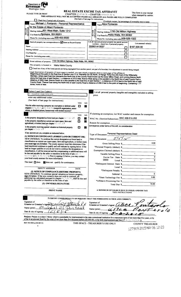| 3 | 05/05/2015 | DPR | DEED OF PERSONAL REPRESENTATIVE | PONTAROLO ALBERT | PONTAROLO ALICE | | | | 127909 | 2015-03802 |