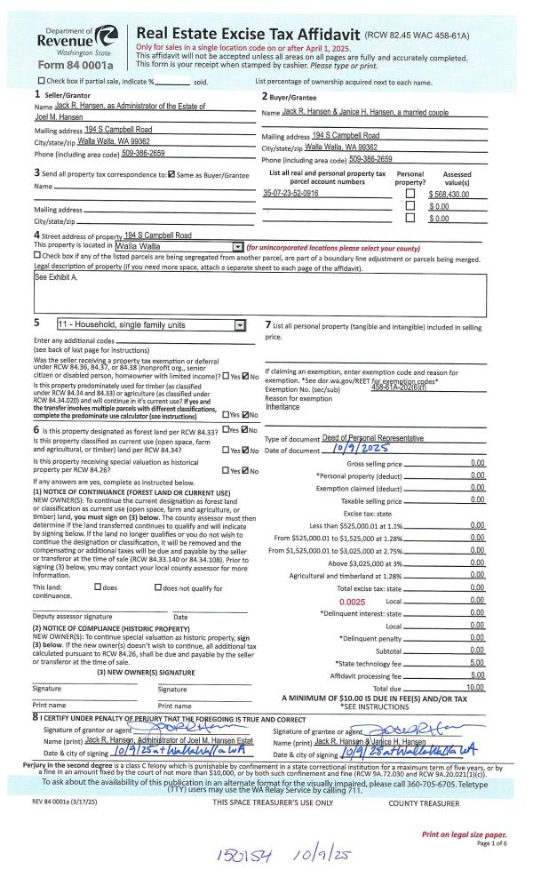 | 1 | 10/09/2025 | QCD | QUIT CLAIM DEED | HANSEN JOEL M | HANSEN JACK R & JANICE H | | | | 150154 | 2025-06186 |