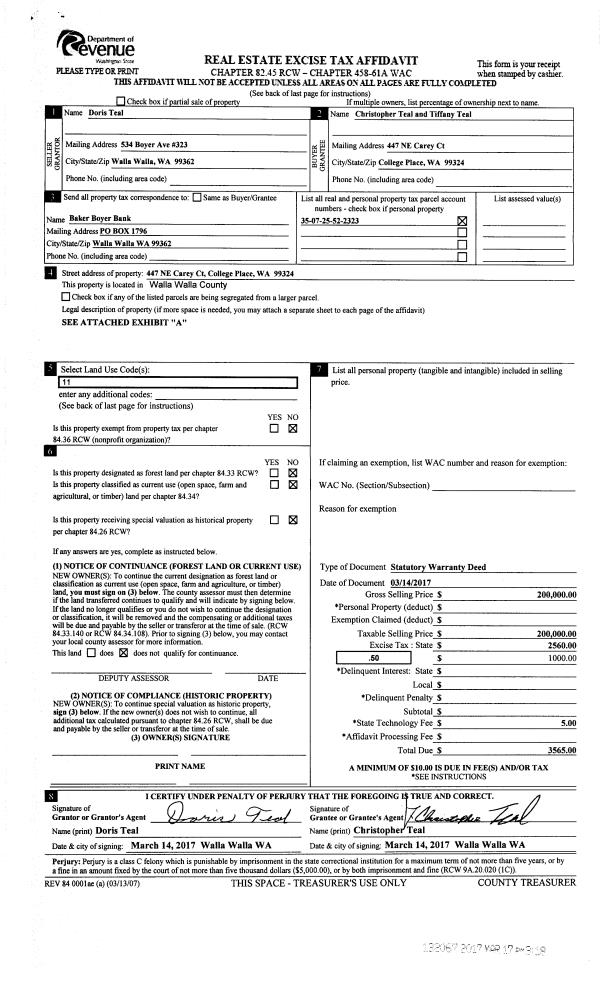 | 1 | 03/17/2017 | SWD | STATUTORY WARRANTY DEED | TEAL DORIS | TEAL CHRISTOPHER & TIFFANY | | | $200,000.00 | 132067 | 2017-02072 |