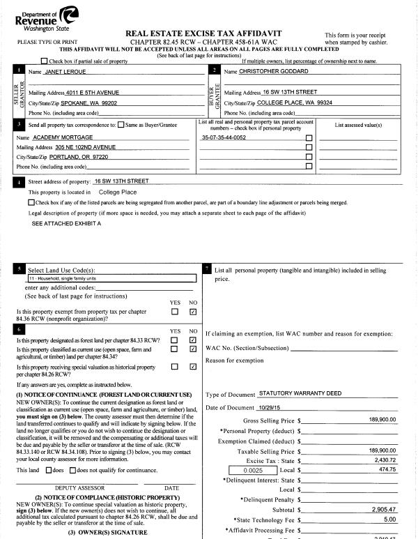 | 2 | 10/30/2015 | SWD | STATUTORY WARRANTY DEED | LEROUE JIM S & JANET E | GODDARD CHRISTOPHER | | | $189,900.00 | 129105 | 2015-09512 |