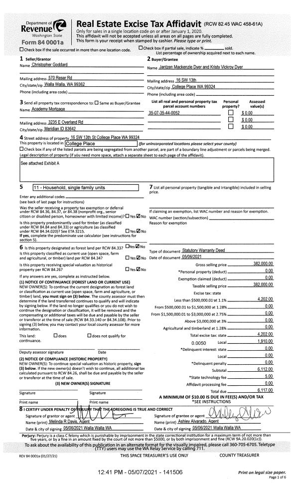 | 1 | 05/07/2021 | SWD | STATUTORY WARRANTY DEED | GODDARD CHRISTOPHER | DYER JANTZEN MACKENZIE & KRISTY VICKROY | | | $382,000.00 | 141506 | 2021-05506 |