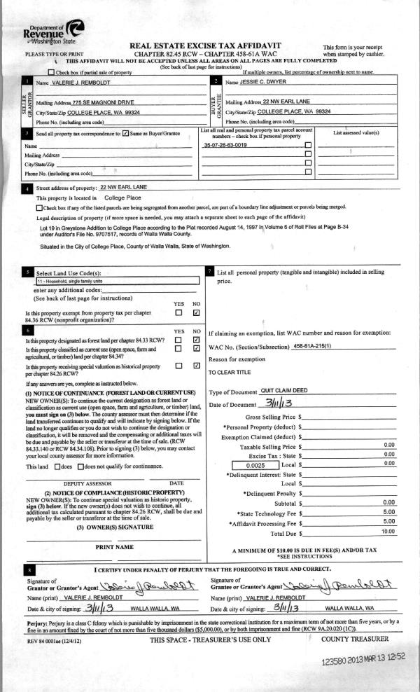 | 3 | 03/13/2013 | QCD | QUIT CLAIM DEED | DWYER JESSIE | DWYER JESSIE C | | | $0.00 | 123580 | 2013-02330 |