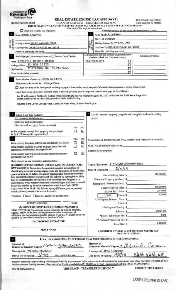 | 2 | 03/13/2013 | WARRANTY D | WARRANTY DEED | DWYER JESSIE C | CORSON ALVIN R & RUTH M | | | $170,000.00 | 123581 | 2013-02331 |