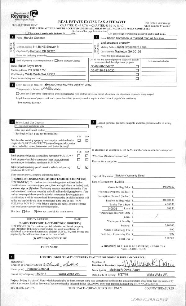 | 4 | 08/27/2018 | SWD | STATUTORY WARRANTY DEED | GUTTERUD HARUKO | SORENSEN KHALID | | 2-PARCELS | $340,000.00 | 135469 | 2018-07278 |