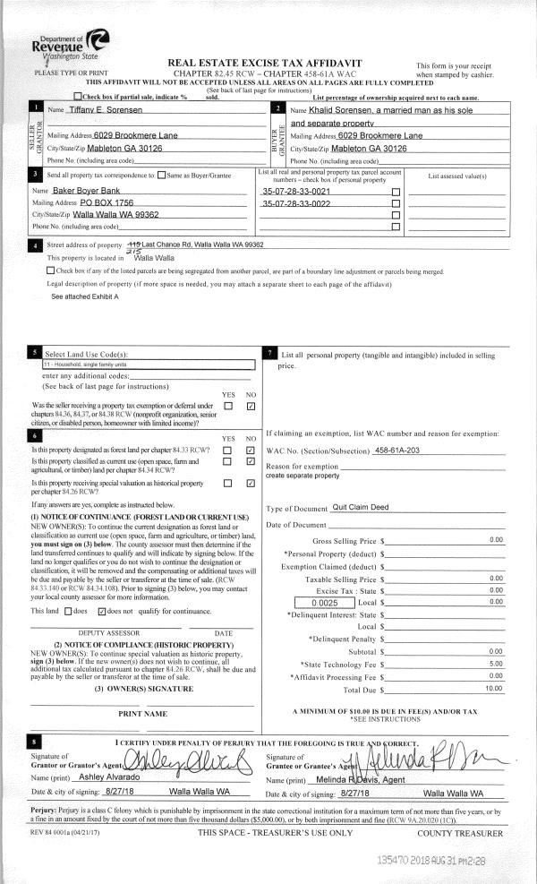| 3 | 08/31/2018 | QCD | QUIT CLAIM DEED | SORENSEN TIFFANY E | SORENSEN KHALID | | 2-PARCLES | $0.00 | 135470 | 2018-07279 |