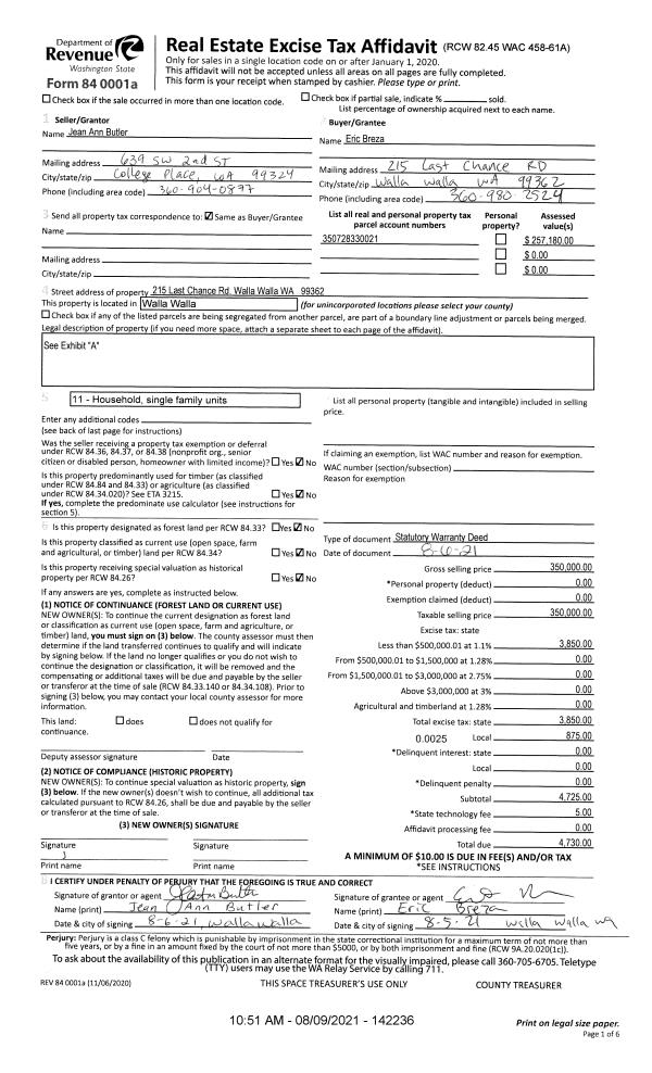 | 1 | 08/09/2021 | SWD | STATUTORY WARRANTY DEED | BUTLER JEAN ANN | BREZA ERIC | | | $350,000.00 | 142236 | 2021-09640 |