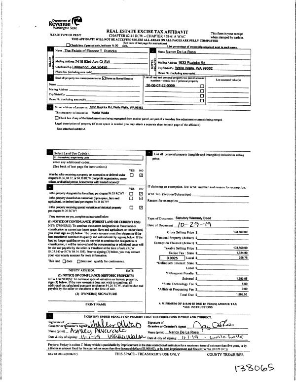 | 1 | 11/13/2019 | SWD | STATUTORY WARRANTY DEED | RUZICKA ELEANOR T ESTATE OF | DE LA ROSA NANCY | | | $103,500.00 | 138065 | 2019-09325 |
