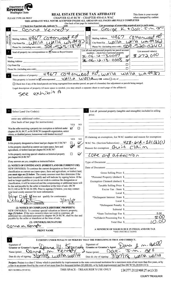 | 1 | 03/27/2018 | QCD | QUIT CLAIM DEED | KENNEDY DONNA M | BELL GEORGE K | | | $0.00 | 134377 | 2018-02328 |