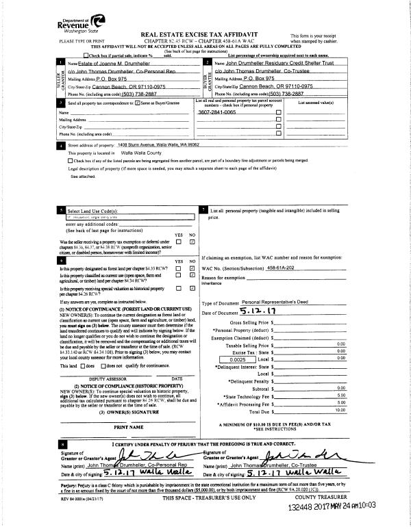 | 8 | 05/12/2017 | DPR | DEED OF PERSONAL REPRESENTATIVE | DRUMHELLER JOHN RESIDUARY CREDIT SHELTER TRUST & | DRUMHELLER JOHN RESIDUARY CREDIT SHELTER TRUST | | | $0.00 | 132448 | 2017-03902 |