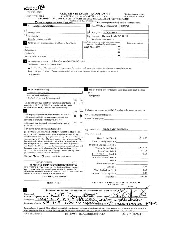 | 2 | 10/30/2019 | BARGAIN & | BARGAIN & SALE DEED | DRUMHELLER DANIEL R | DRUMHELLER CHRISTY LINN ET AL | | | $21,173.00 | 137987 | 2019-08846 |