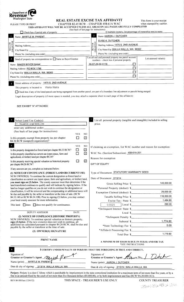 | 3 | 02/14/2014 | SWD | STATUTORY WARRANTY DEED | SMITH MYRTLE M | DUTCHER AARON J & ELISE K | | | $145,000.00 | 125440 | 2014-01131 |