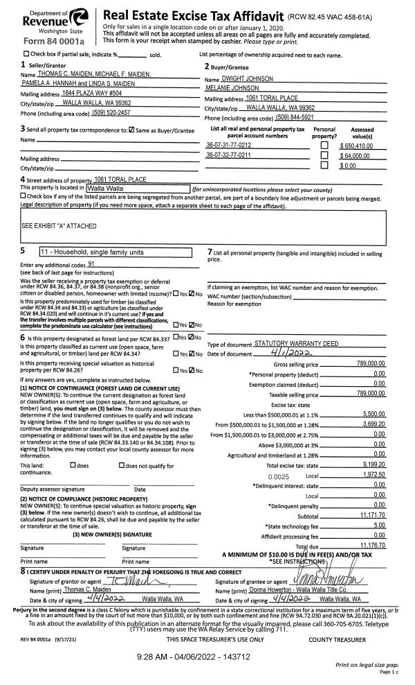 | 1 | 04/06/2022 | SWD | STATUTORY WARRANTY DEED | MAIDEN THOMAS C ET AL | JOHNSON DWIGHT & MELANIE | | 2-PARCELS | $789,000.00 | 143712 | 2022-02850 |