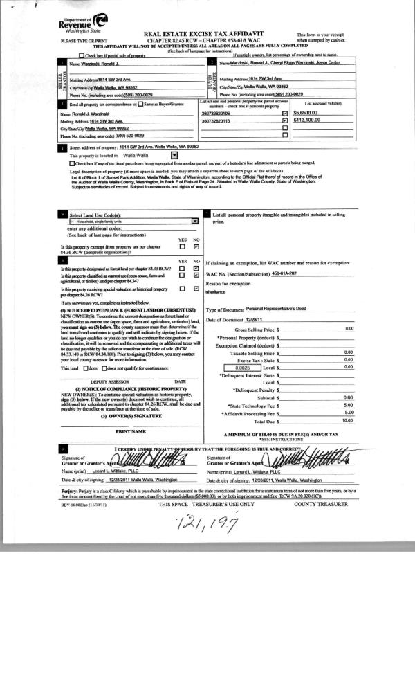 | 2 | 12/29/2011 | WARRANTY D | WARRANTY DEED | WARZINSKI, WILLIAM ESTATE OF | WARZINSKI, CHERYL (UND 3/4 INT | | | | 121197 | 2011-10285 |
