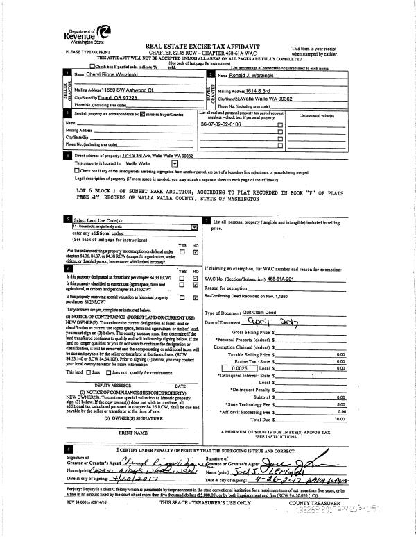 | 1 | 04/26/2017 | QCD | QUIT CLAIM DEED | WARZINSKI CHERYL L | WARZINSKI RONALD J | | | $0.00 | 132268 | 2017-03111 |