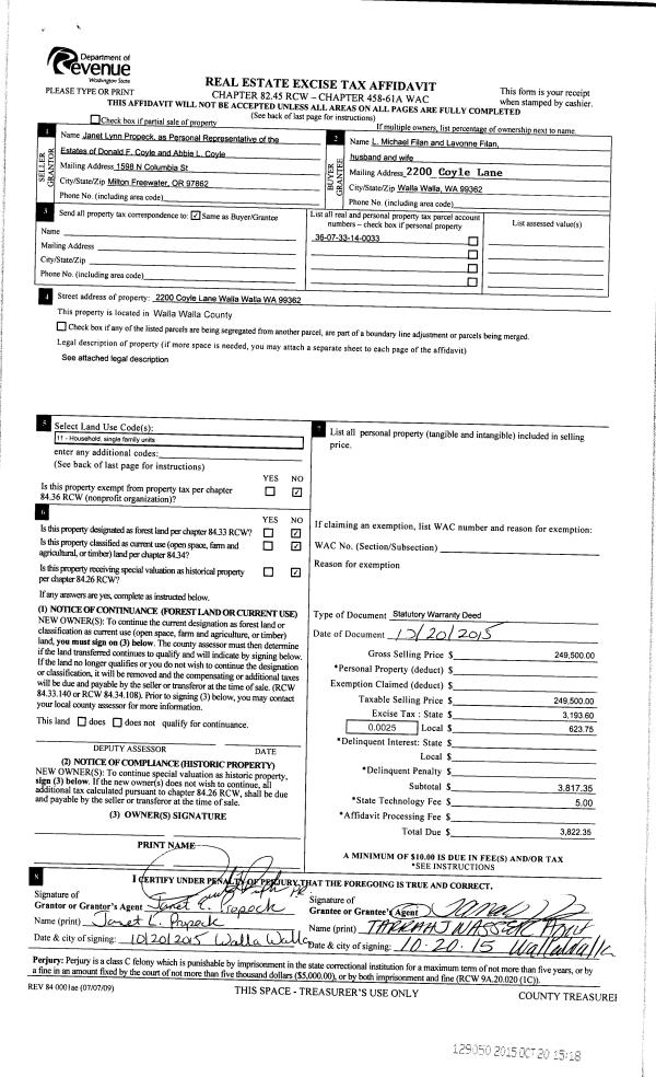 | 1 | 10/20/2015 | SWD | STATUTORY WARRANTY DEED | COYLE DONALD F ESTATE OF | FILAN L MICHAEL & LAVONNE | | | $249,500.00 | 129050 | 2015-09182 |