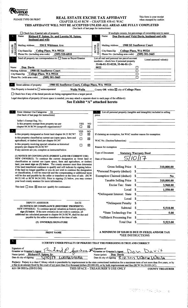 | 1 | 05/12/2017 | SWD | STATUTORY WARRANTY DEED | SPIESS RICHARD P SR & LORETTA | DAVIS DON & VICKI | | 2-PARCELS | $310,000.00 | 132370 | 2017-03570 |