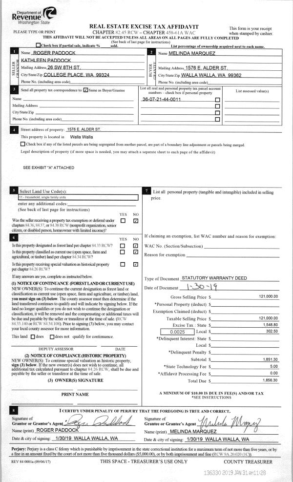 | 1 | 01/31/2019 | SWD | STATUTORY WARRANTY DEED | PADDOCK ROGER E & KATHLEEN C | MARQUEZ MELINDA | | | $121,000.00 | 136330 | 2019-00640 |