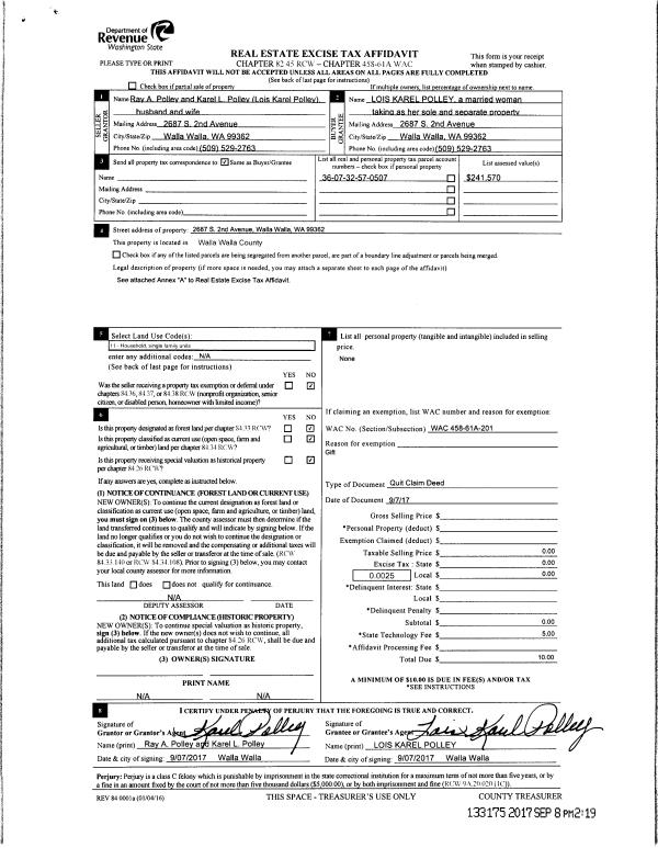 | 2 | 09/07/2017 | QCD | QUIT CLAIM DEED | POLLEY RAY A & KAREL L | POLLEY LOIS KAREL | | | $0.00 | 133175 | 2017-07060 |