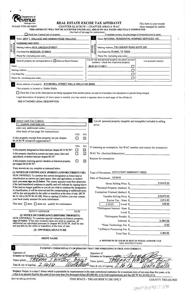 | 3 | 02/17/2016 | SWD | STATUTORY WARRANTY DEED | WALLACE JEFF T | NATIONAL RESIDENTIAL NOMINEE SERVICES INC | | | $219,875.00 | 129697 | 2016-01187 |