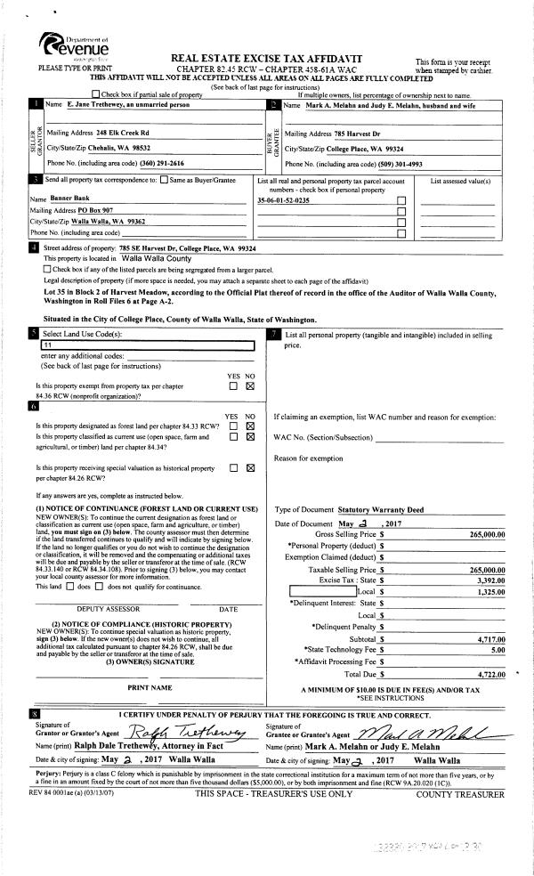 | 1 | 05/04/2017 | SWD | STATUTORY WARRANTY DEED | TRETHEWEY ELMA JANE | MELAHN MARK A & JUDY E | | | $265,000.00 | 132320 | 2017-03352 |