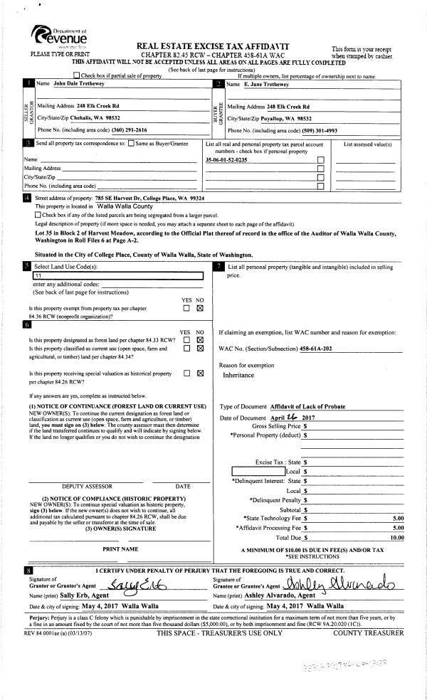 | 2 | 04/26/2017 | LOPA | LACK OF PROBATE AFFIDAVIT | TRETHEWEY JOHN DALE | TRETHEWEY ELMA JANE | | | $0.00 | 132319 | 2017-03350 |