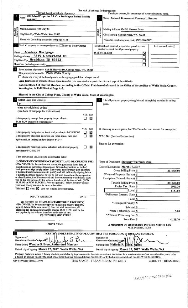 | 3 | 03/22/2017 | SWD | STATUTORY WARRANTY DEED | OLD INLAND PROPERTIES LLC | BROXSON DALTON J & COURTNEY L | | | $231,500.00 | 132085 | 2017-02194 |