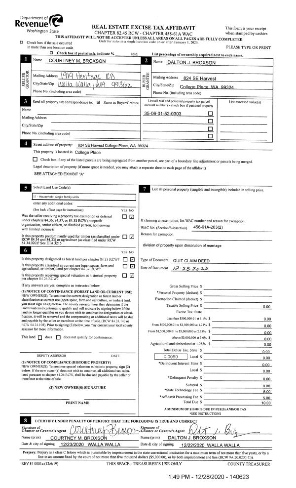 | 2 | 12/23/2020 | QCD | QUIT CLAIM DEED | BROXSON DALTON J & COURTNEY L | BROXSON DALTON J | | | $0.00 | 140623 | 2020-13814 |