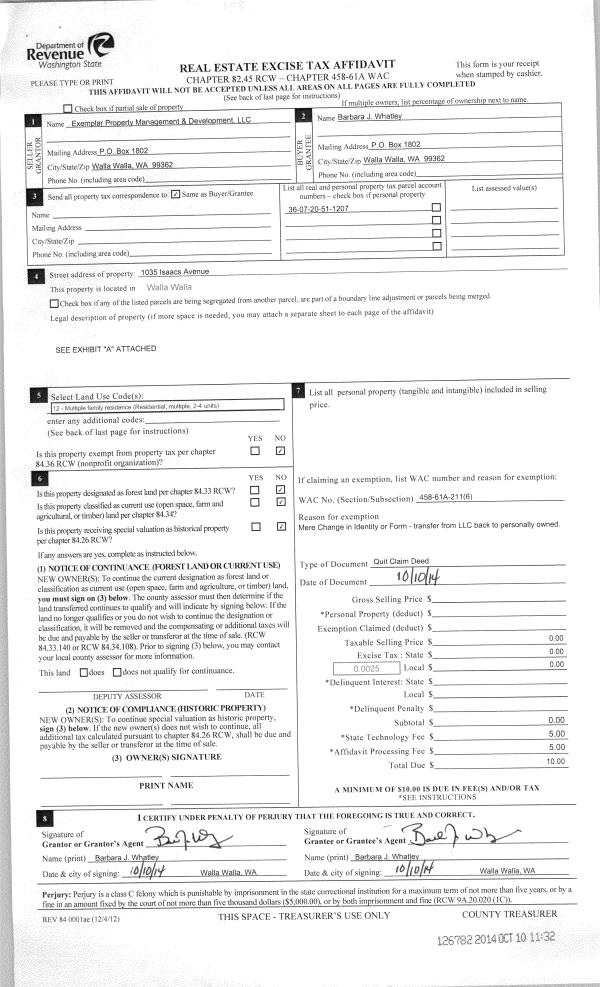 | 4 | 10/10/2014 | QCD | QUIT CLAIM DEED | EXEMPLAR PROPERTY MANAGEMENT & DEV LLC | WHATLEY BARBARA J | | | $0.00 | 126782 | 2014-07469 |