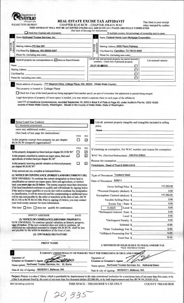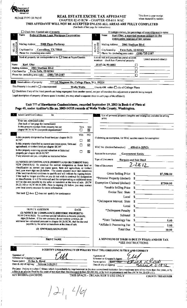 | 2 | 02/29/2012 | WARRANTY D | WARRANTY DEED | FEDERAL HOME LOAN MORTGAGE COR | OLER, KERI | | | $87,500.00 | 121461 | 2012-01712 |