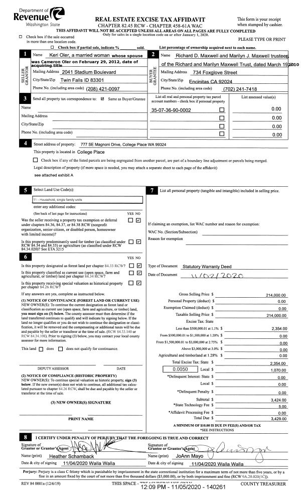 | 1 | 11/05/2020 | SWD | STATUTORY WARRANTY DEED | OLER KERI | RICHARD & MARILYN MAXWELL TRUST | | | $214,000.00 | 140261 | 2020-11590 |