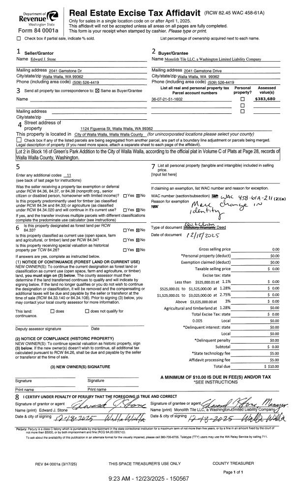 | 1 | 12/23/2025 | QCD | QUIT CLAIM DEED | STONE EDWARD J | MONOLITH TILE LLC | | | | 150567 | 2025-07886 |