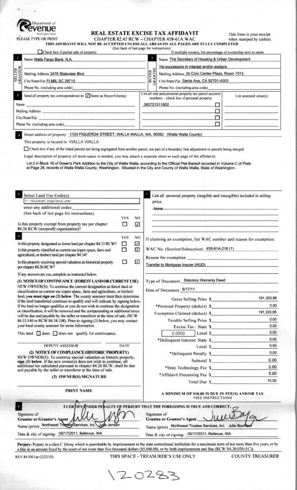 | 5 | 04/13/2011 | WARRANTY D | WARRANTY DEED | NORTHWEST TRUSTEE SERVICES INC | WELLS FARGO BANK NA | | | $209,879.00 | 120008 | 2011-03052 |