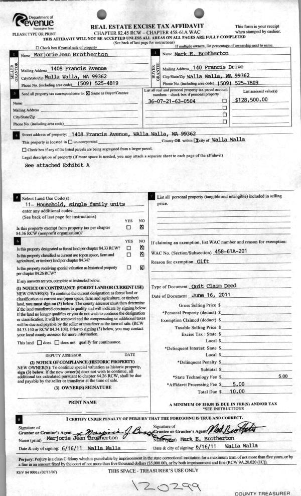 | 5 | 06/23/2011 | QCD | QUIT CLAIM DEED | BROTHERTON, MARJORIE J | BROTHERTON, MARJORIE LIFE ESTA | | | | 120299 | 2011-04889 |