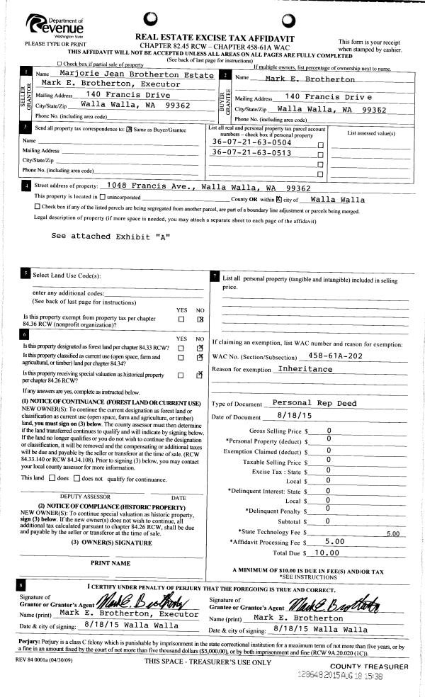 | 4 | 08/18/2015 | DPR | DEED OF PERSONAL REPRESENTATIVE | BROTHERTON MARJORIE LIFE ESTATE | BROTHERTON MARK E | 2 PARCELS | | $0.00 | 128648 | 2015-07239 |