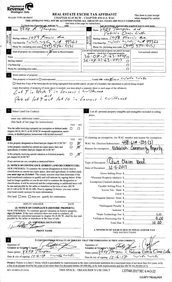 | 2 | 12/05/2017 | QCD | QUIT CLAIM DEED | THOMPSON PHILLIP A | THOMPSON PHILLIP A | | | $0.00 | 133748 | 2017-09797 |