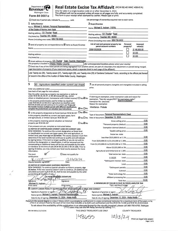 | Mailing Address: | % MICHAEL S INGHAM 1211 GARDENA CRK RD TOUCHET, WA 99360 | % Ownership: | 100.0000000000% |