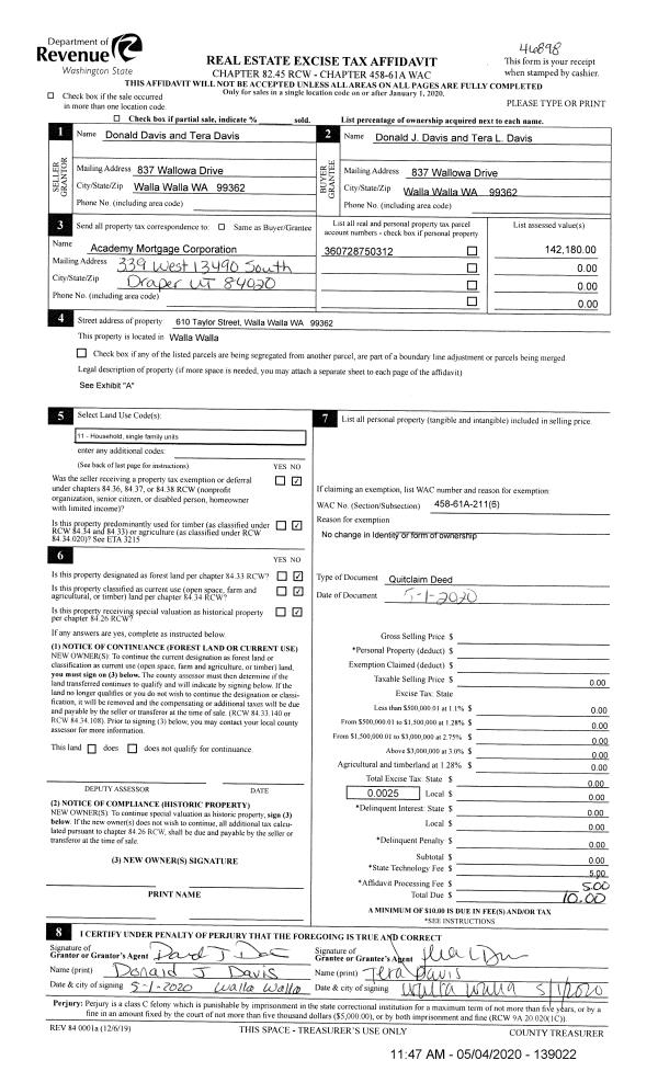 | 1 | 05/01/2020 | QCD | QUIT CLAIM DEED | DAVIS DONALD & TERA | DAVIS DONALD & TERA L | | | $0.00 | 139022 | 2020-03815 |