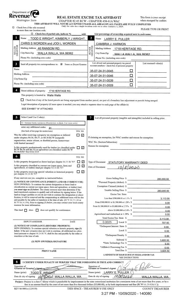 | 1 | 10/08/2020 | SWD | STATUTORY WARRANTY DEED | WRIGHT TODD E & KIMBERLY J | PULLER LARRY E & CAMBRIA J HARMON | | 4-PARCLES | $283,000.00 | 140080 | 2020-10479 |