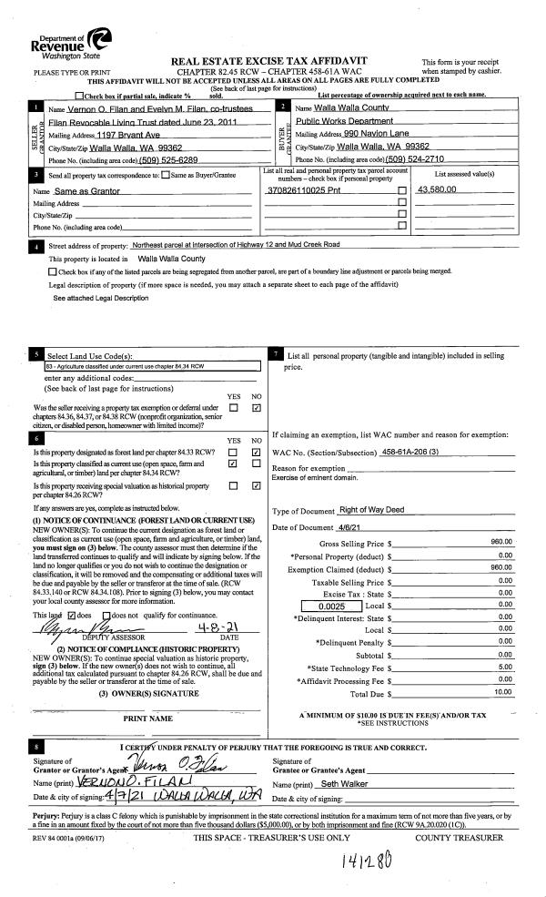 | 2 | 04/08/2021 | EASE | EASEMENT | FILAN VERNON O & EVELYN M | WALLA WALLA COUNTY | | | | 141280 | 2021-04073 |
