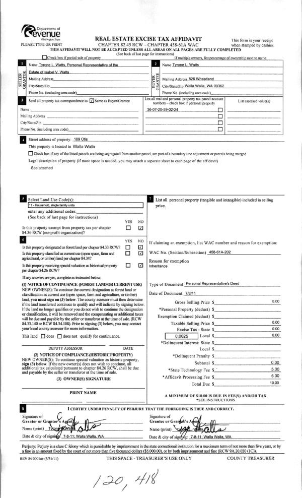 | 2 | 07/18/2011 | WARRANTY D | WARRANTY DEED | WATTS, ISABEL ESTATE OF | WATTS, TYRONE L | | | | 120418 | 2011-05536 |