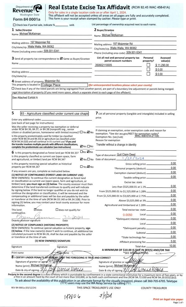| 1 | 07/01/2024 | BLAGQCC | BOUNDRY LINE AGREEMENT QUIT CLAIM CONVEYANCE | MCKEIRNAN MICHAEL J | MCKEIRNAN MICHAEL J | | | | 147806 | 2024-03531 |