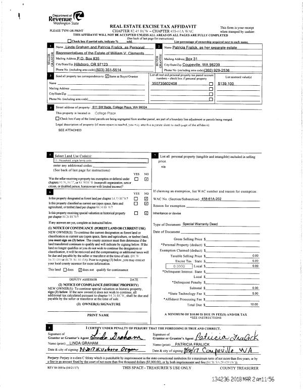 | 2 | 03/02/2018 | SWP | Special Warranty Deed | CLEMENTS WILLIAM V | FRALICK PATRICIA | | | $0.00 | 134236 | 2018-01674 |