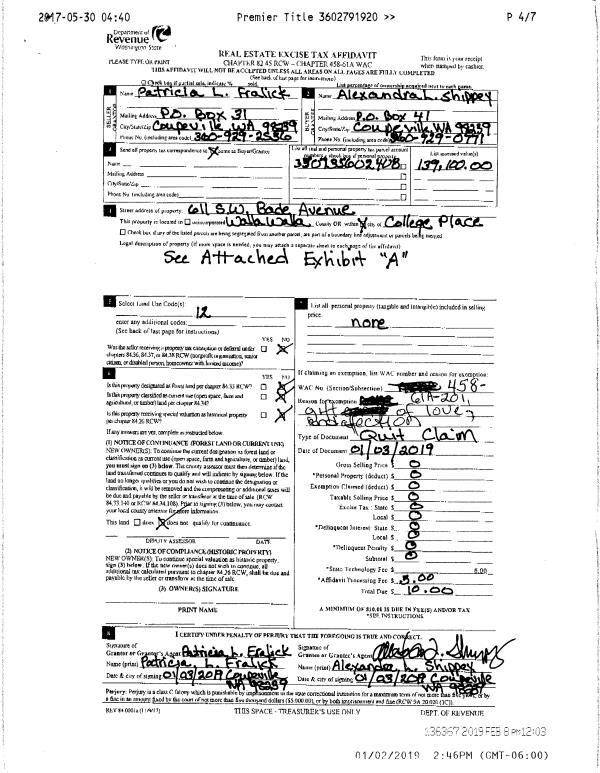 | 1 | 02/08/2019 | QCD | QUIT CLAIM DEED | FRALICK PATRICIA | SHIPPEY ALEXANDRA L | | | $0.00 | 136367 | 2019-00887 |