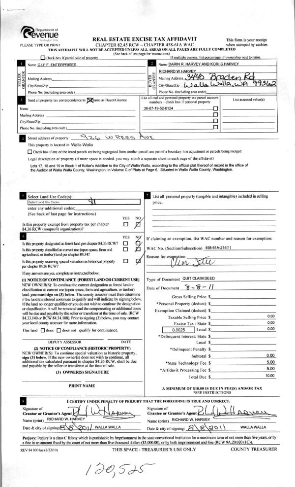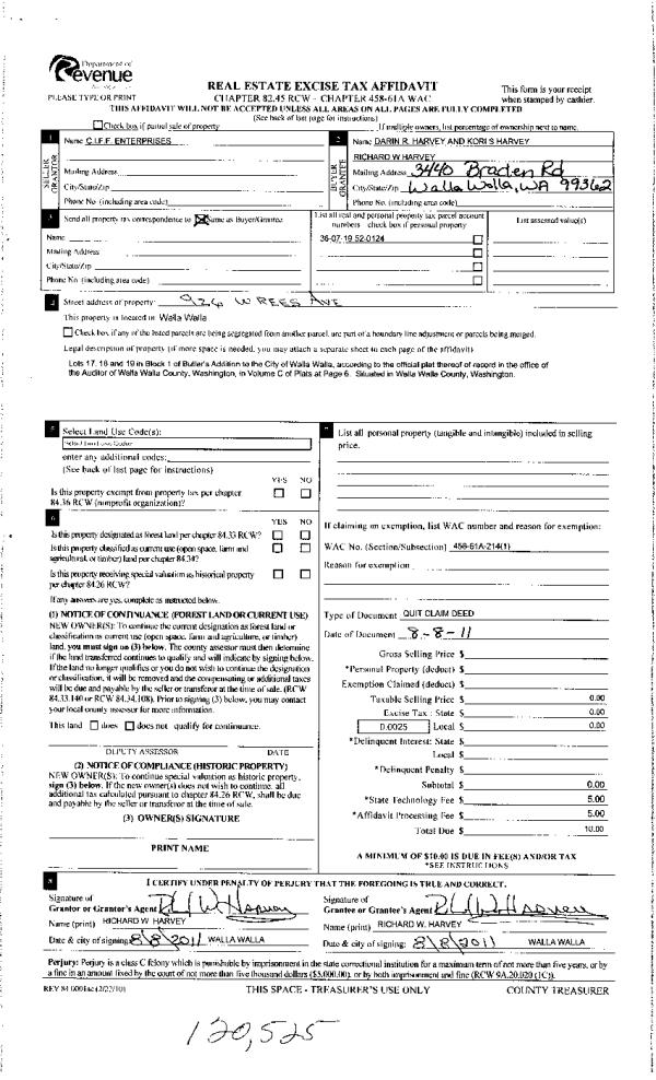 | 4 | 08/10/2011 | QCD | QUIT CLAIM DEED | C.I.F.F. ENTERPRISES | HARVEY, DARIN R & KORI S | | | | 120525 | 2011-06239 |